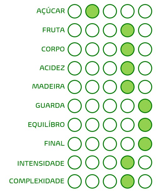 Na boca é intenso e longo, sente-se a textura dos frutos pretos maduros, boa acidez e taninos maduros e suaves, tornando-o envolvente e elegante.