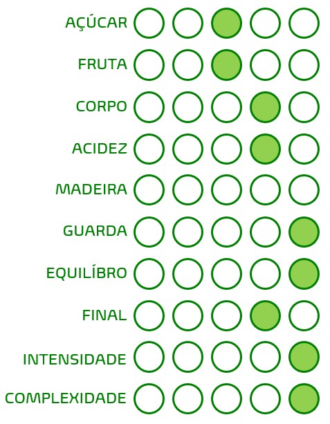 Cor palha brilhante com bolha fina e persistente. Aroma elegante de fruta branca, de mel, notas de panificação como biscoito e algumas notas florais.