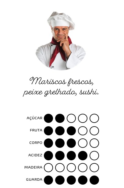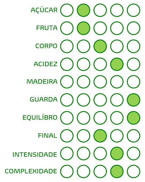 Verde-limão, frutado com intenso aroma a frutos maduros do pomar. Encorpado e ao mesmo tempo suave, macio, com um delicioso toque de citrinos num longo, agradável e elegante final de prova.